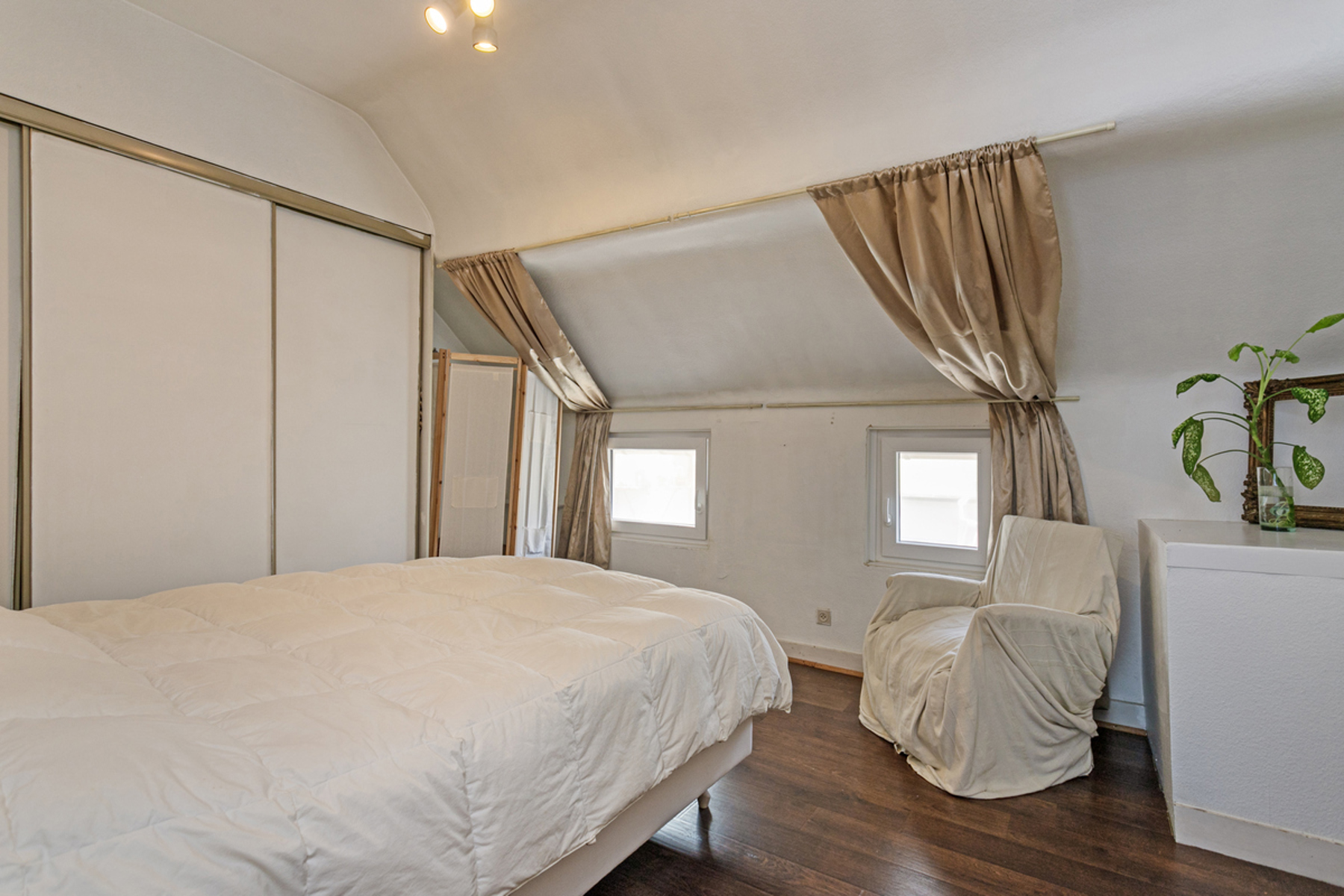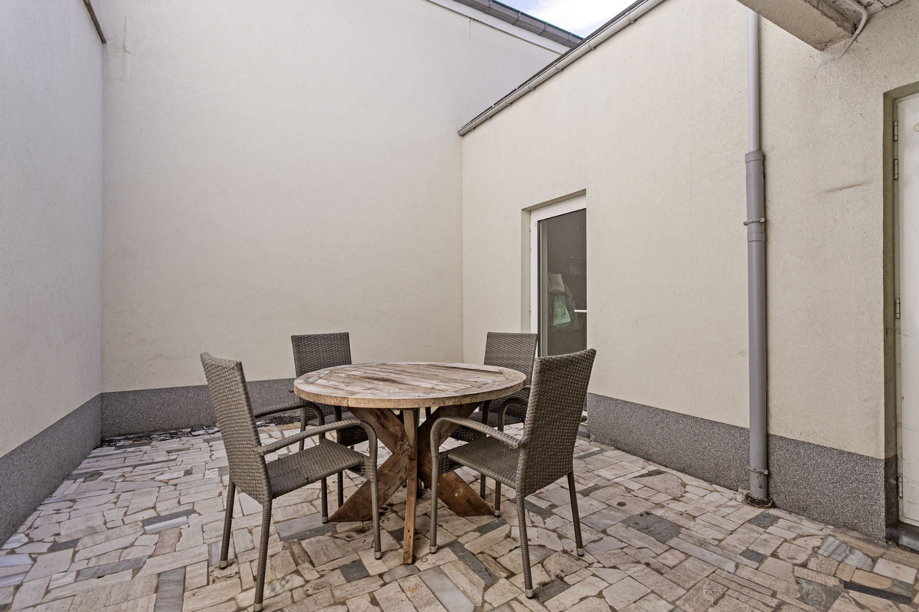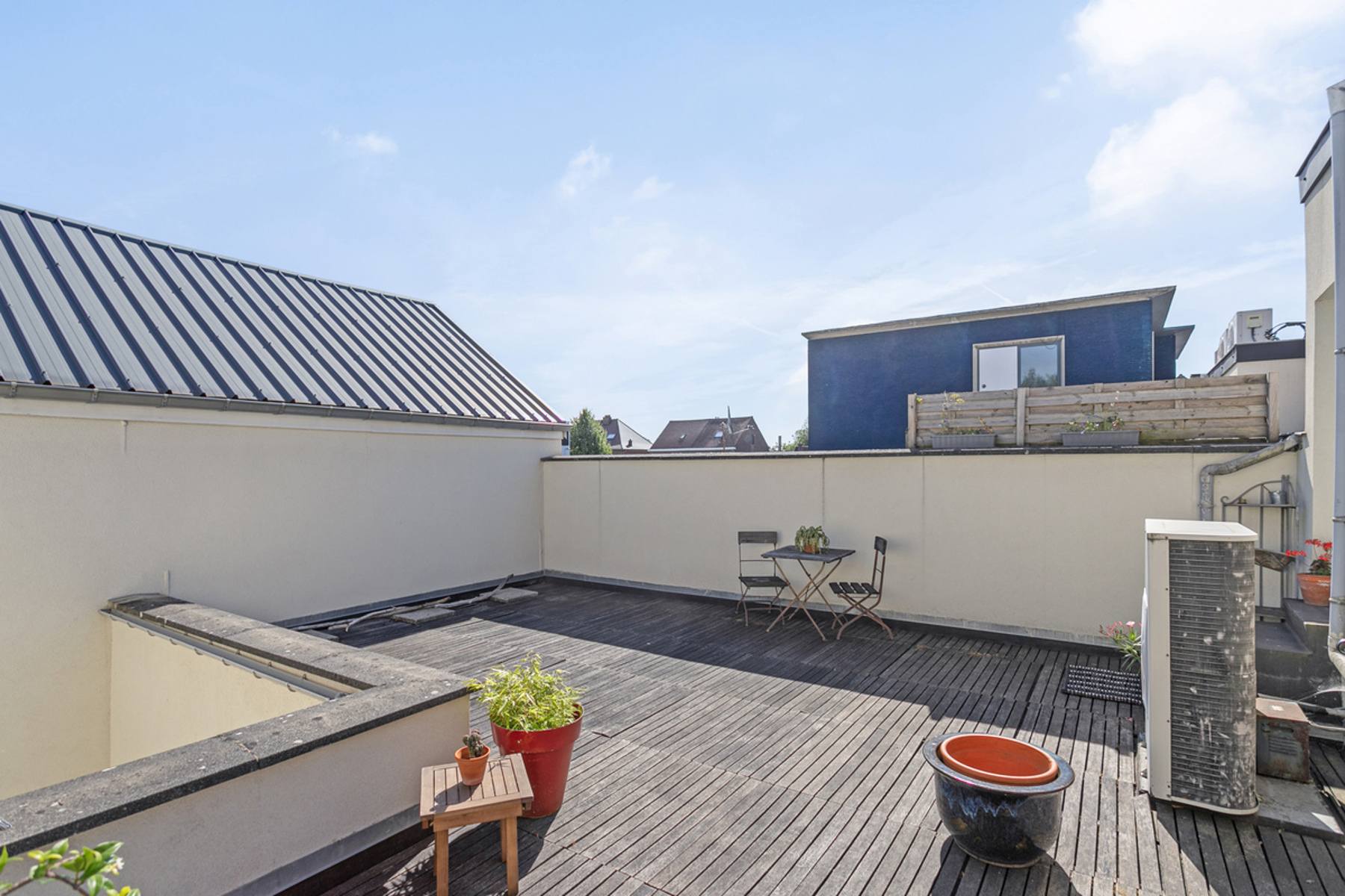 On the first floor, without lift, is a 2-bedroom flat with a living area of +/-103m², comprising: entrance hall - kitchen (electric hob, oven, sink)(+/-8m²) - living room + dining room (+/-24m²) - 2 bedrooms (+/-16m², +/-17m²) - bathroom (bath, double washbasin, toilet, space for washing machine) (+/-7m²) - terrace (+/-49m²).