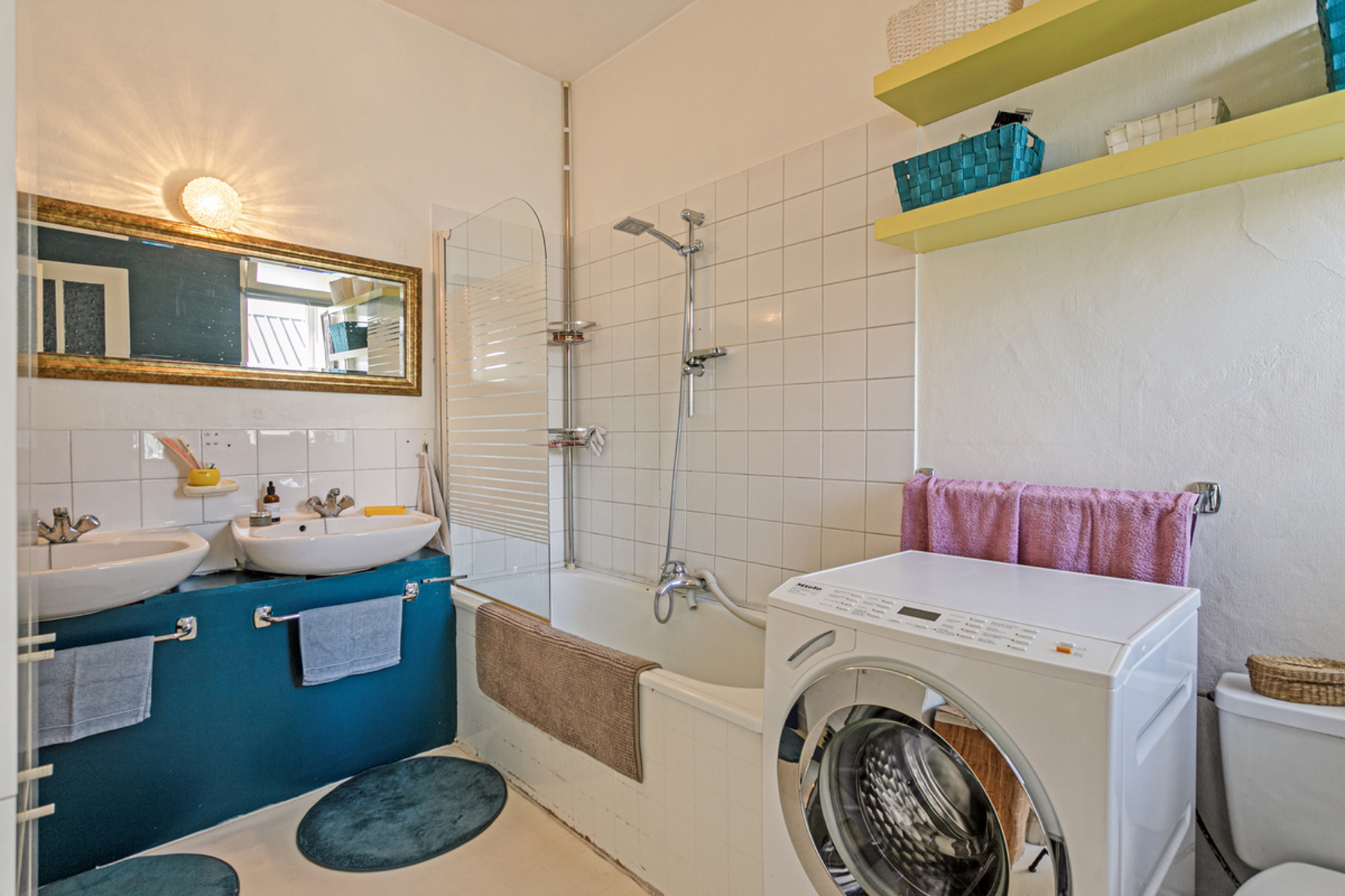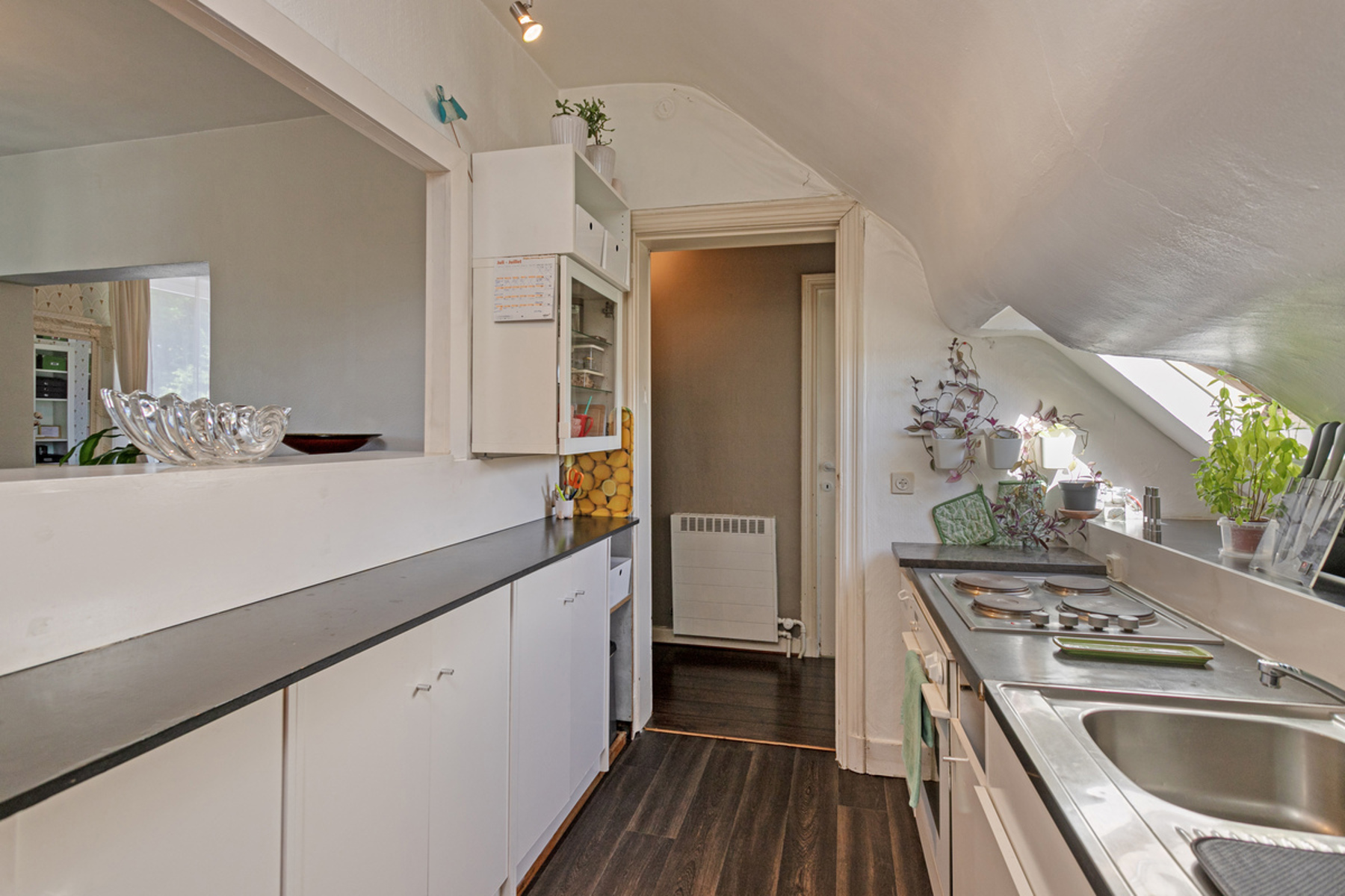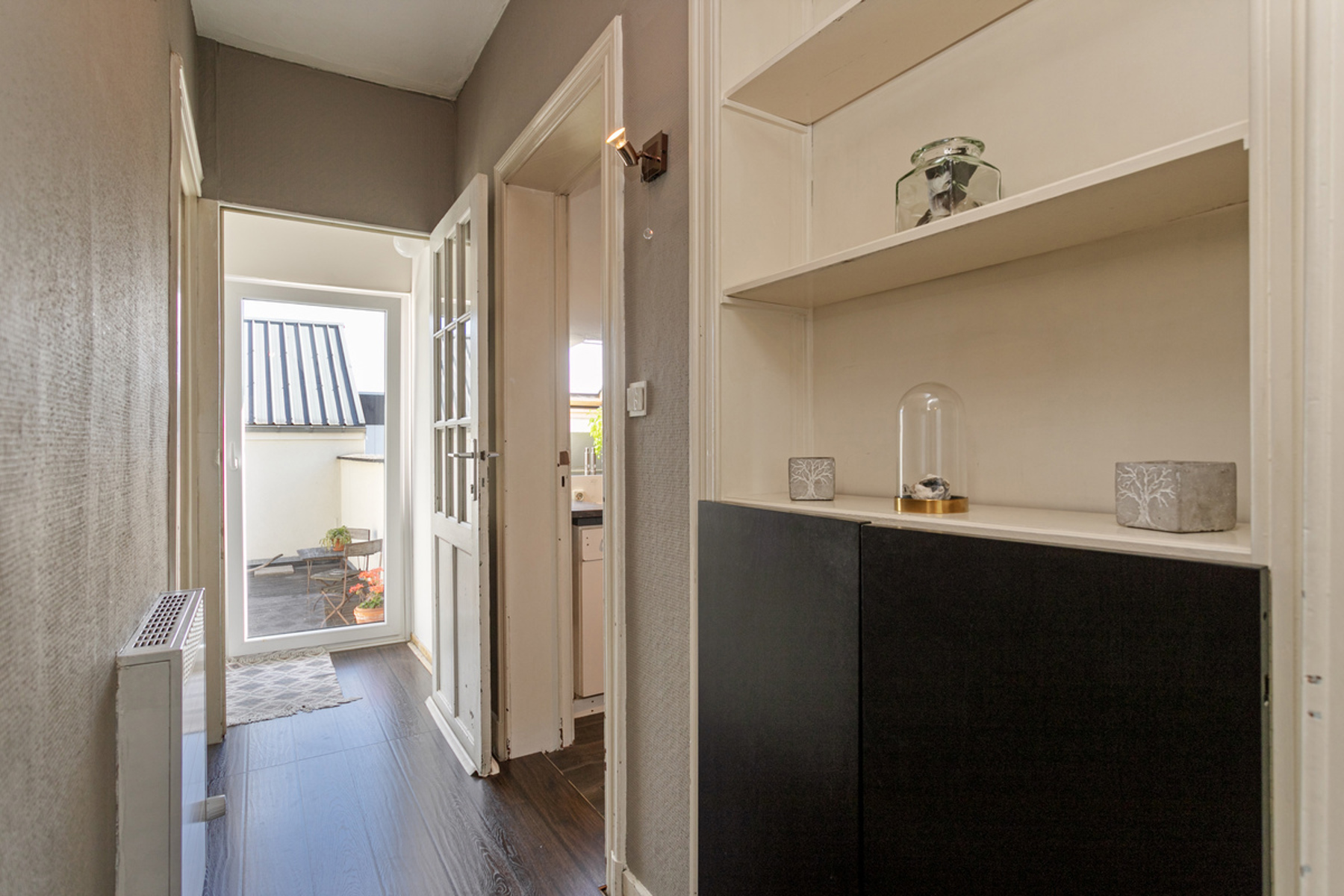 On the first floor, without lift, is a 2-bedroom flat with a living area of +/-103m², comprising: entrance hall - kitchen (electric hob, oven, sink)(+/-8m²) - living room + dining room (+/-24m²) - 2 bedrooms (+/-16m², +/-17m²) - bathroom (bath, double washbasin, toilet, space for washing machine) (+/-7m²) - terrace (+/-49m²).