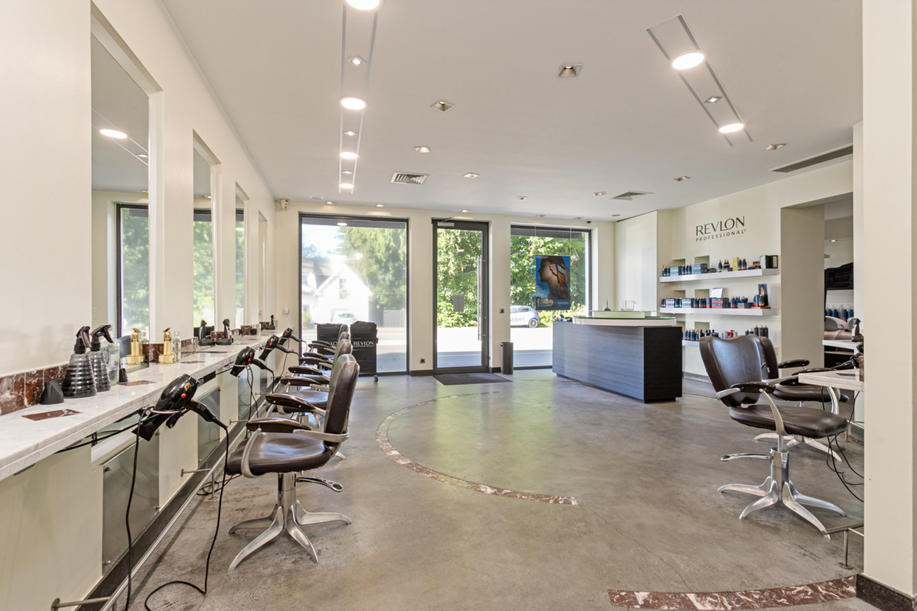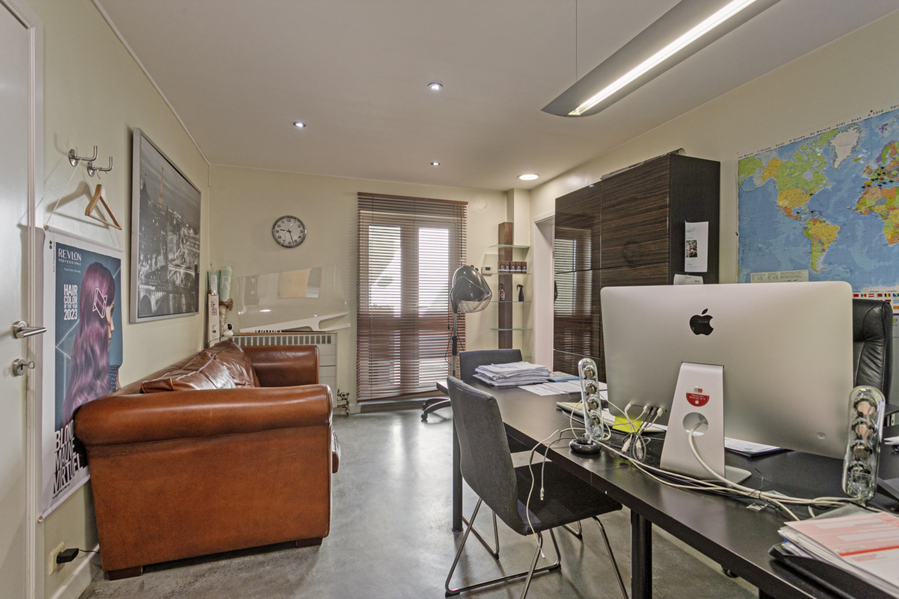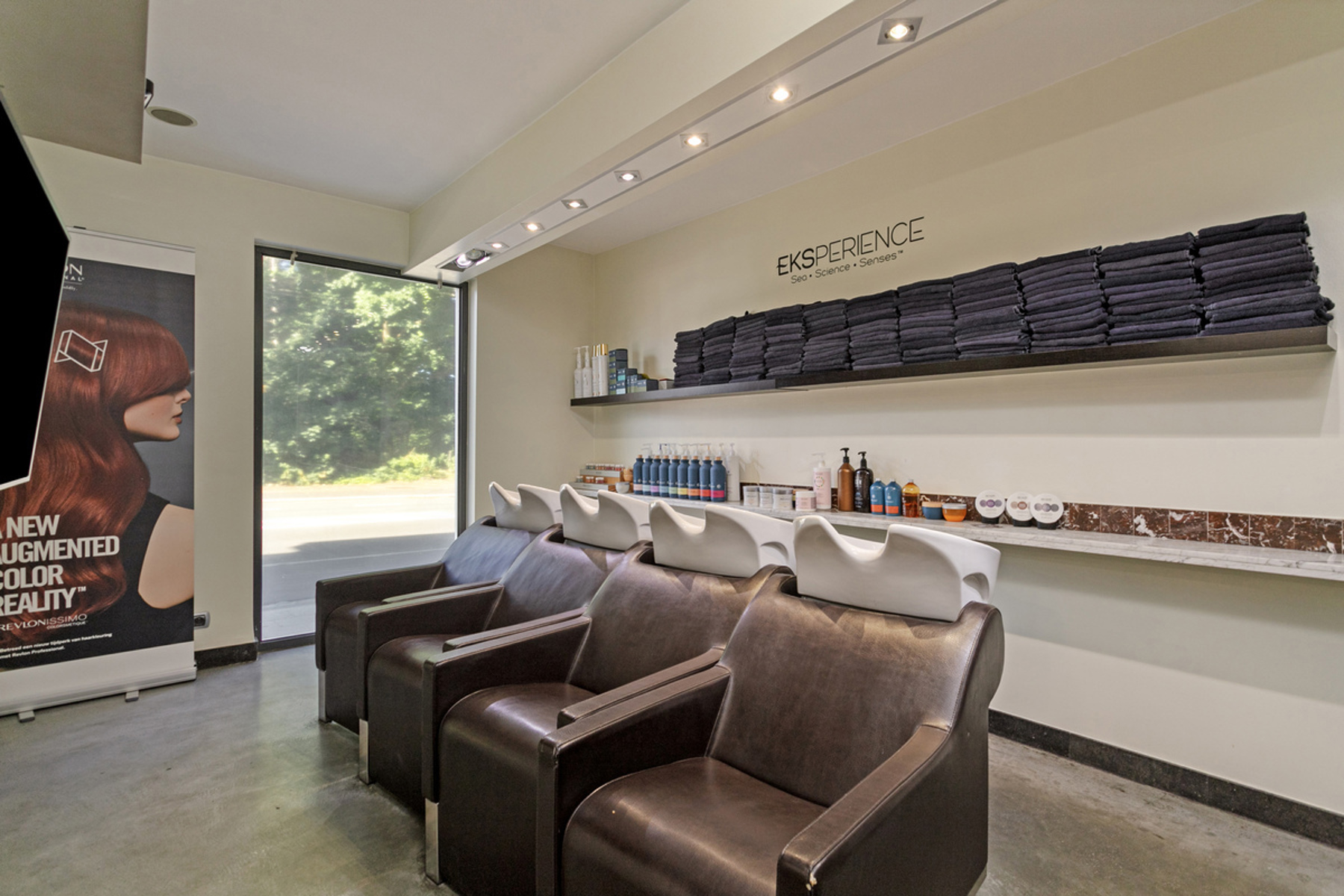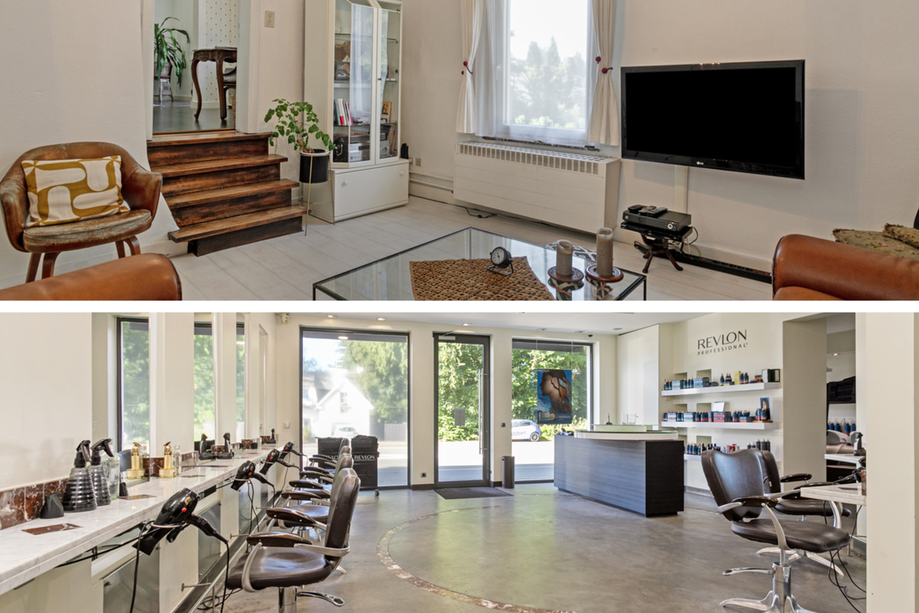 The commercial ground floor currently comprises a +/-130m² hairdressing salon, which is divided as follows: hairdressing salon (+/-62m²) - office (+/-15m²) - kitchen (+/-6m²) - storage space (+/-14m²) - laundry room (+/-5m²) - terrace (+/-19m²).