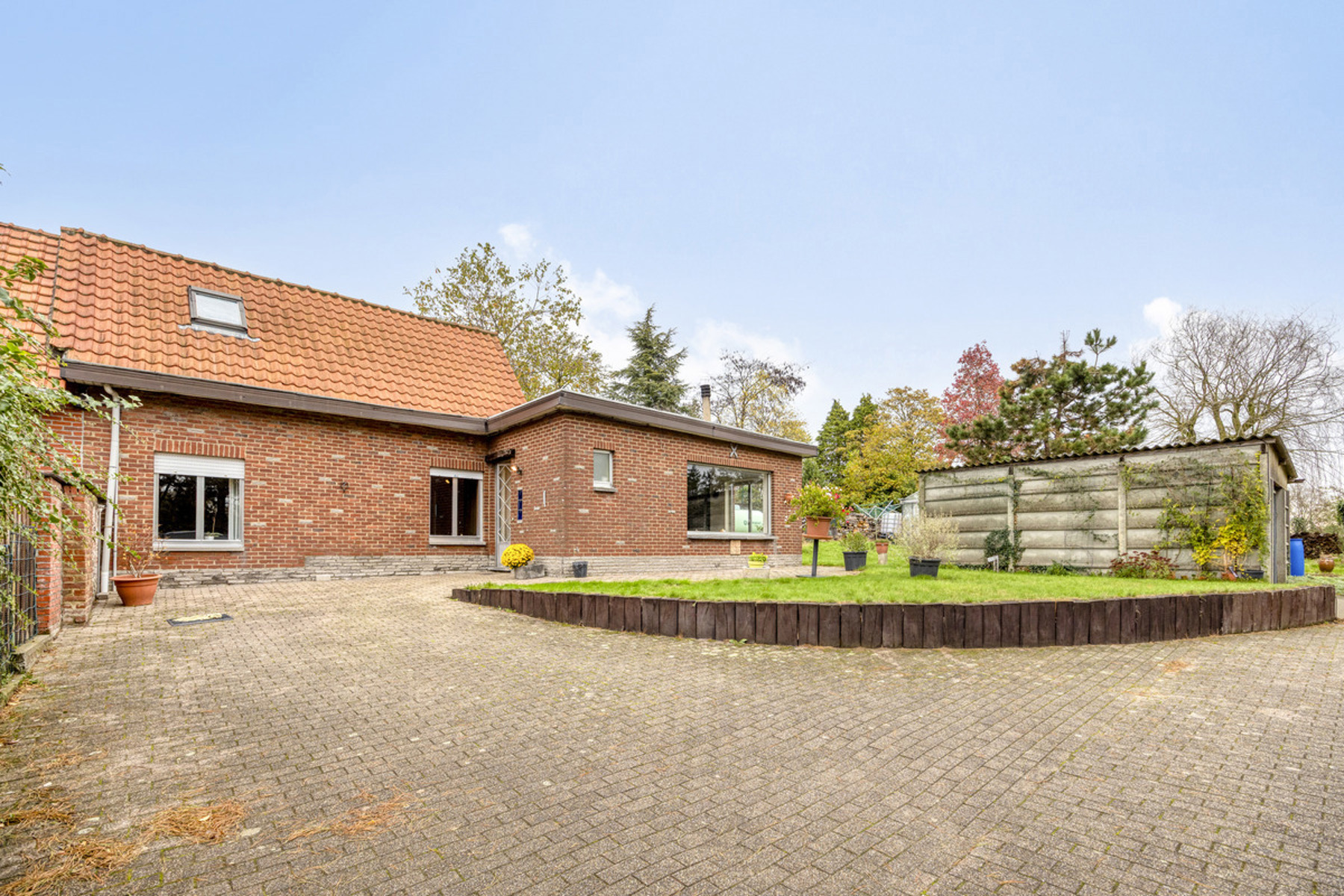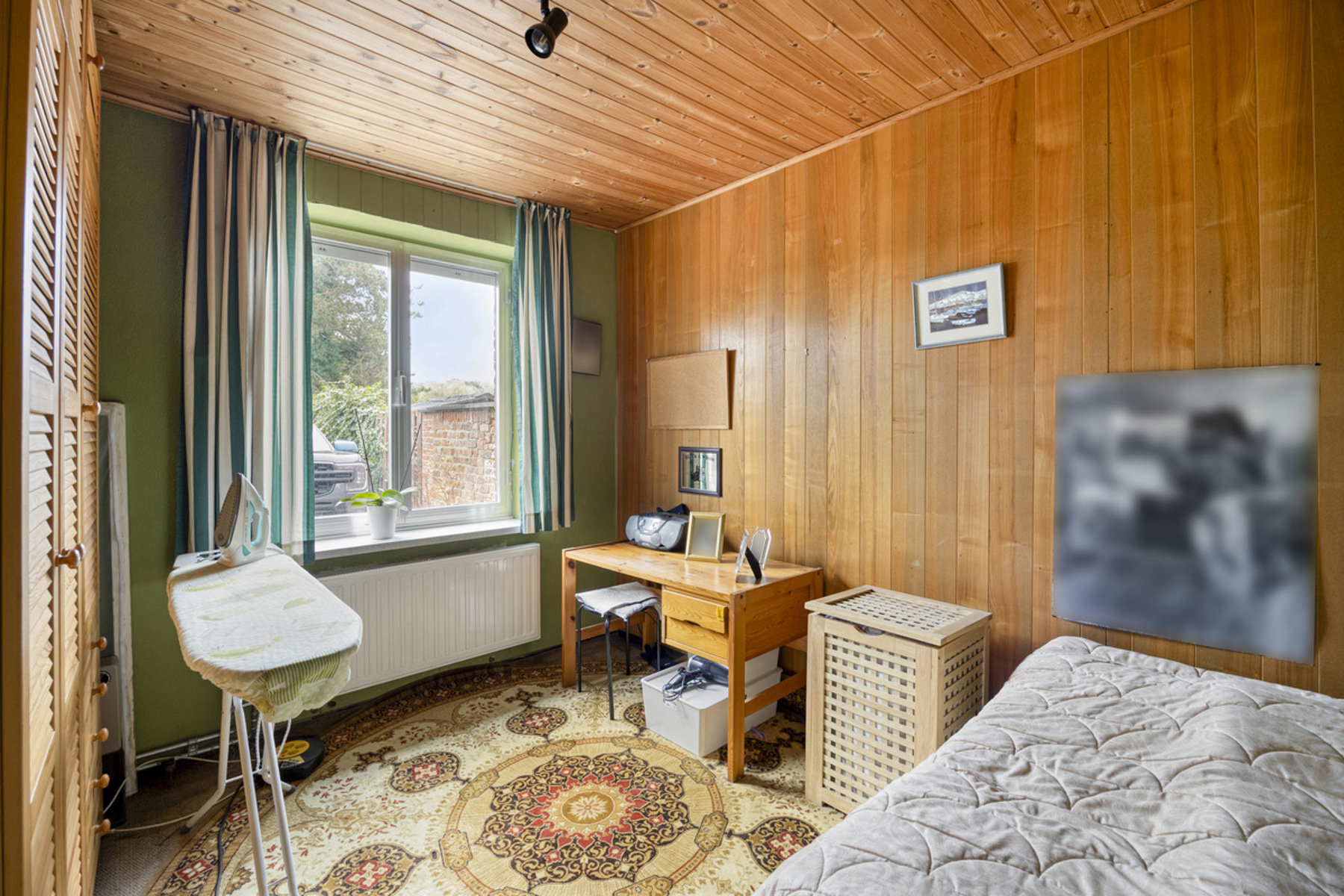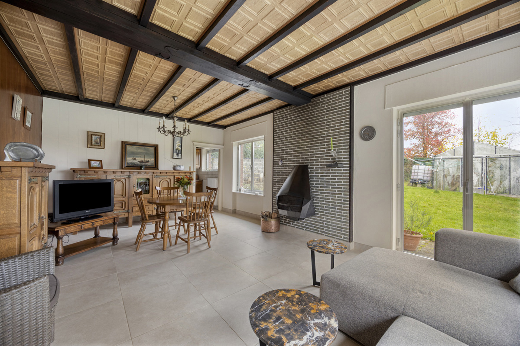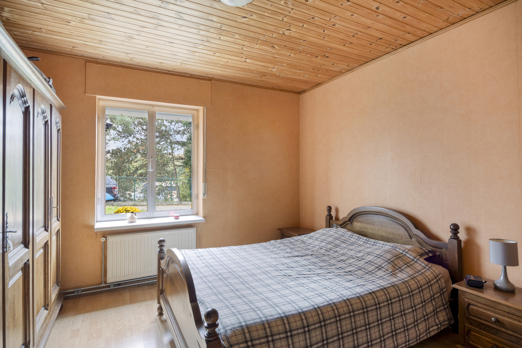 The property, situated on a plot of +/- 7a62ca, offers a living area of +/- 138m² and consists of: entrance hall – toilet – living and dining room with wood stove (+/- 26m²) with access to the south-facing terrace (+/- 14m²) and garden – kitchen (+/- 8m²) (sink, oven, induction hob, refrigerator) – bathroom (walk-in shower, sink) – 2 bedrooms (+/- 10m², +/- 14m²) – storage room (+/- 7m²) – laundry room (+/- 4m²).