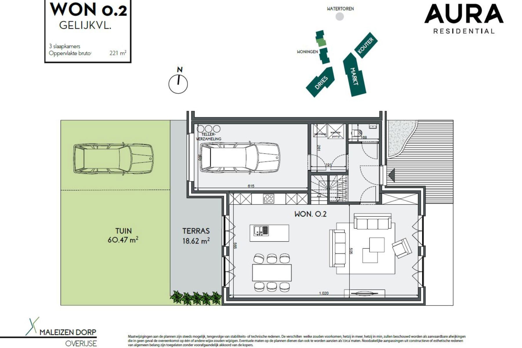 This beautiful house, has a surface of +/-221m² and consists of: entrance hall with space for a cloakroom - toilet with washbasin - living room + dining room + open kitchen with cooking island (+/-54m²) giving access to the southwest facing terrace (+/-18m²) and garden - garage for 1 car (+/-22m²) - laundry room/technical room (+/-5m²).