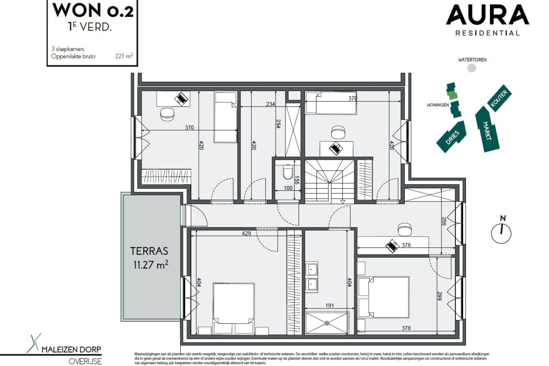 On the first floor: 4 bedrooms (+/-11m², +/-14m², +/-15m² , +/-17m²) - bathroom (+/-7m²) - open office space (+/-9m²) - seperate toilet - dressing (+/-5m²) - terrace (+/-11m²).