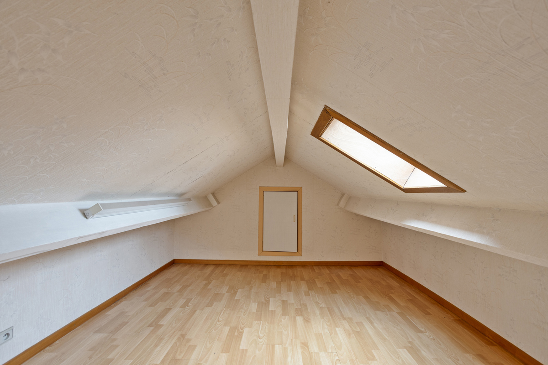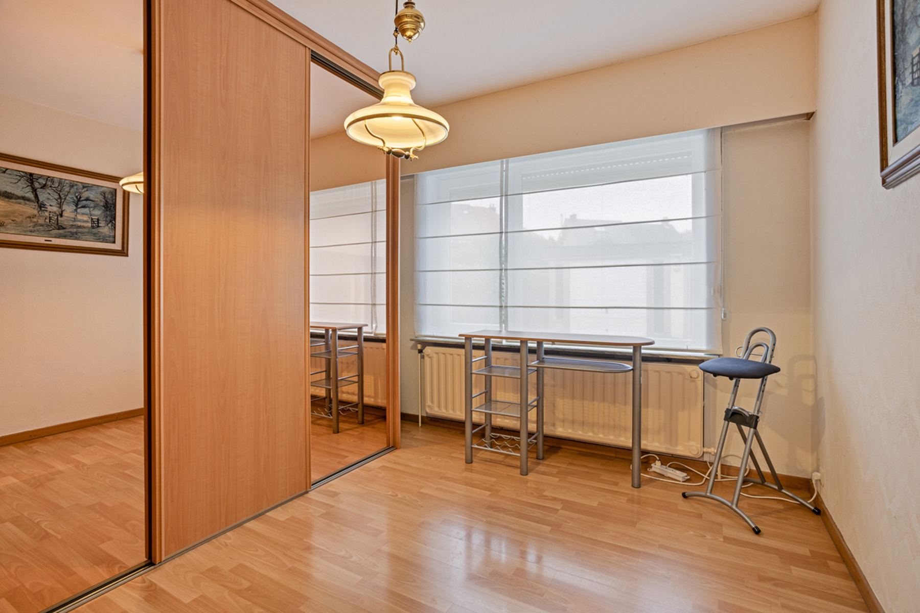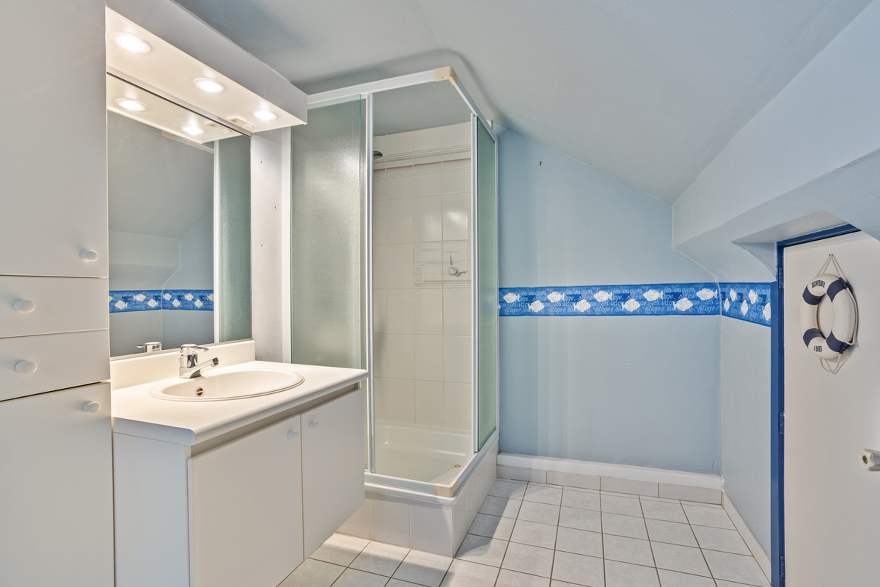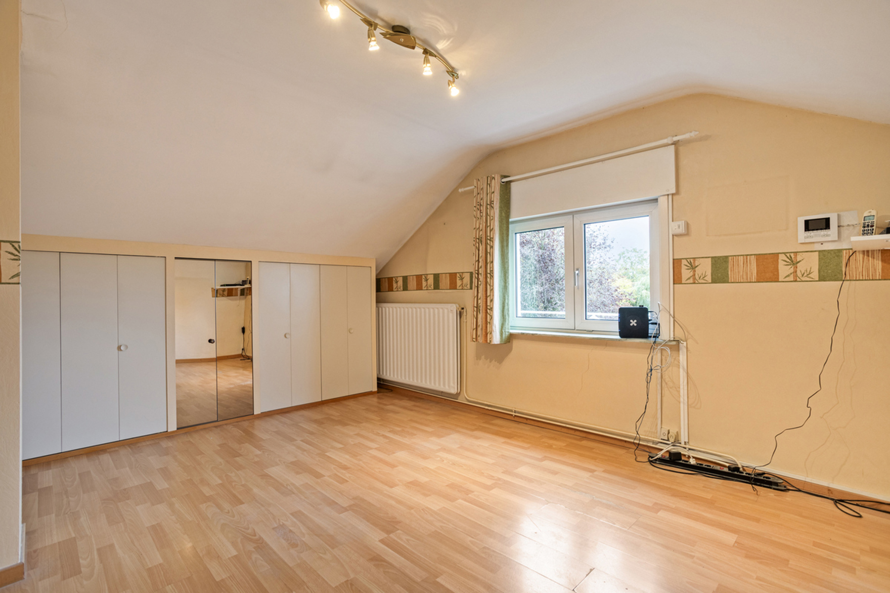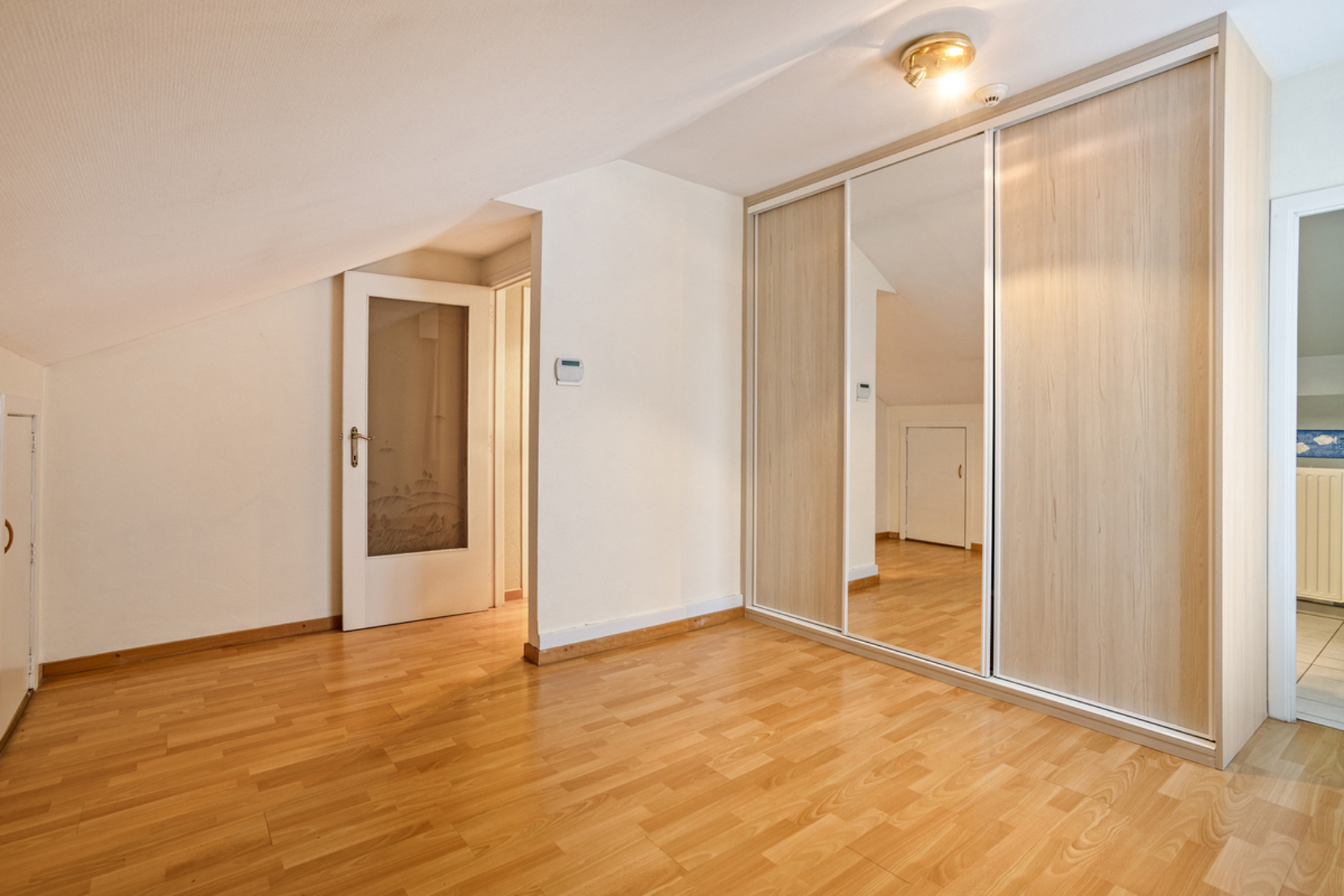 A l'étage: 2 chambres (+/-15m², +/-20m²) avec armoires encastrées et dont une avec salle de bains attenante (douche, lavabo et toilette) et grenier de rangement (+/-14m²).