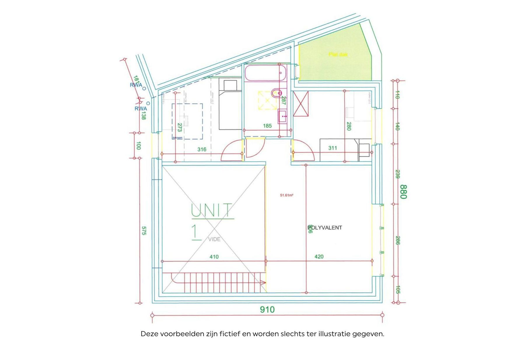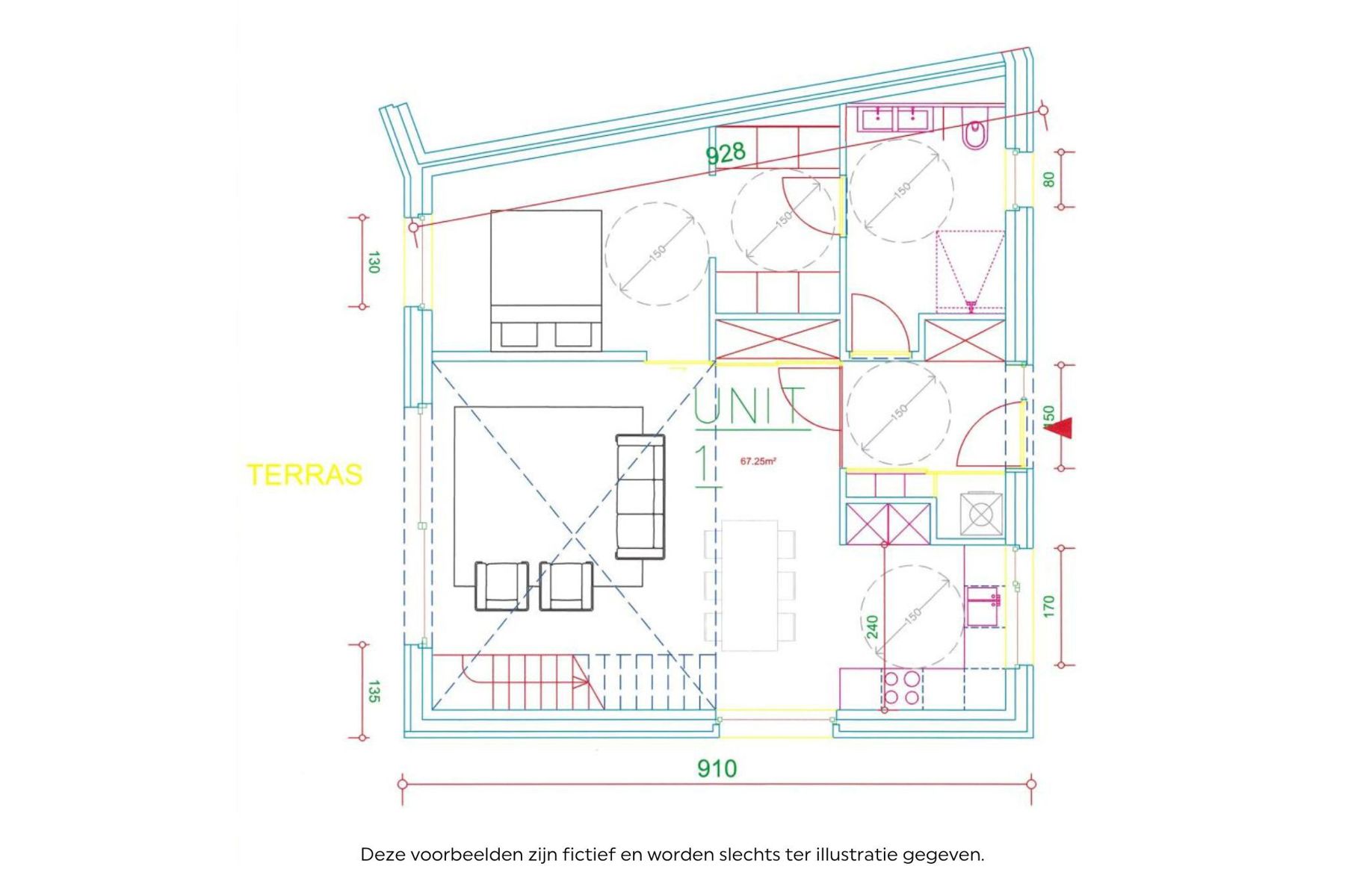 De gegeven informatie en opgegeven oppervlaktes zijn louter indicatief en houden geen enkele juridische verbintenis in.