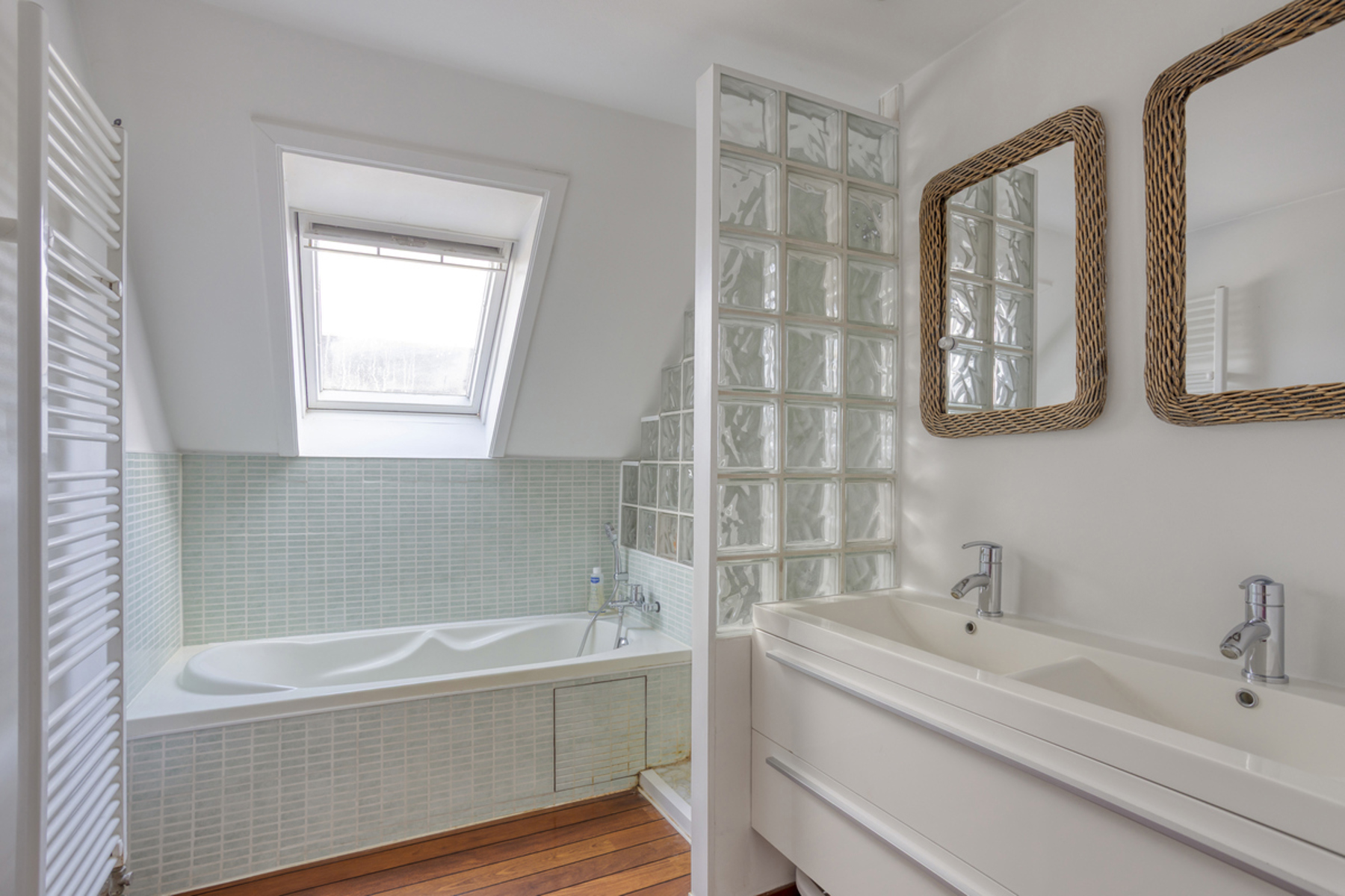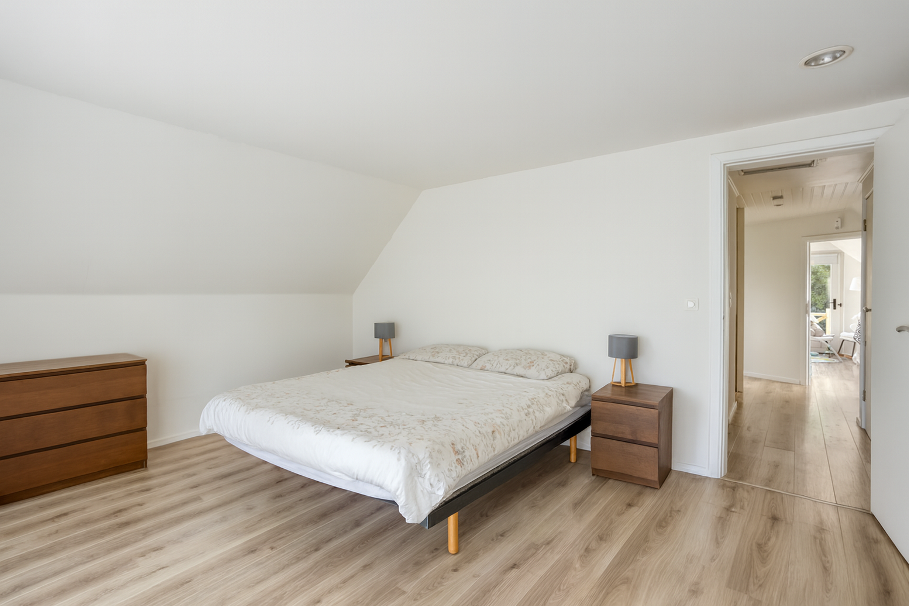 Op de eerste verdieping: master bedroom met ingemaakte kasten en toegang tot het balkon aan de voorkant – 2 slaapkamers waarvan één met ingemaakte kasten en de andere met toegang tot het balkon aan de achterkant – badkamer (dubbele lavabo, ligbad, douche).