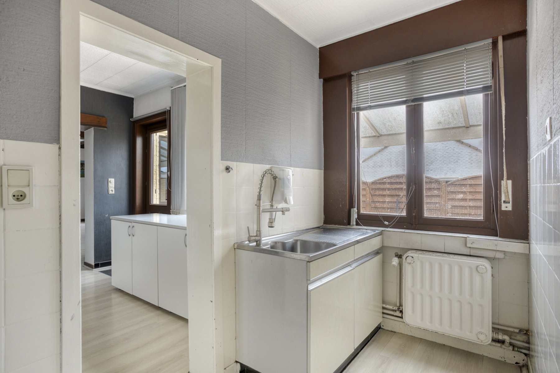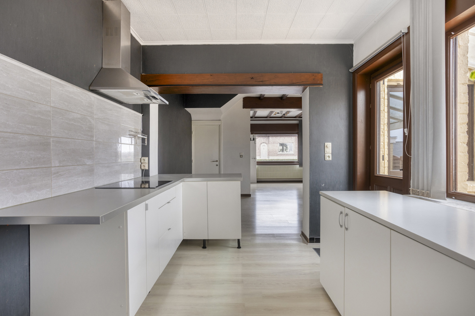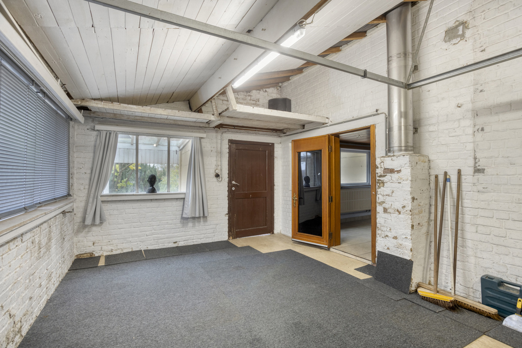 De woning heeft een bewoonbare oppervlakte van ±134m² en bestaat uit: inkomhal – woonkamer (±32m²) + open keuken met houtkachel als met toegang tot het zuid-west gerichte terras (elektrische kookplaat, dampkap)(±12m²) - bijkeuken (±12m²)– badkamer (lavabo, bad, toilet) – atelier + garage (±29m²) - veranda met toegang tot de west gerichte tuin (±10m²) .