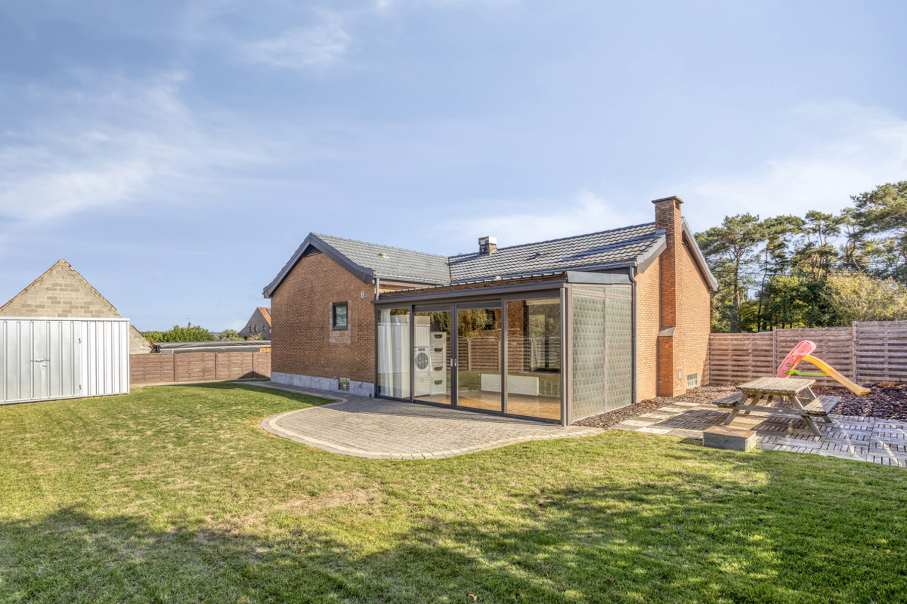 Deze bungalow beschikt over een oppervlakte van +/-223m² en bestaat uit: inkomhal - living + eetkamer + open, ingerichte keuken (inductiekookplaat, dampkap, oven, microgolf, vaatwasser, gootsteen) (+/-37m²) met toegang tot de veranda (+/-18m²), het terras en de tuin (zuidwest gericht) - 3 slaapkamers (+/-8m², +/-12m², +/-12m²) - badkamer (inloopdouche, toilet, lavabo).