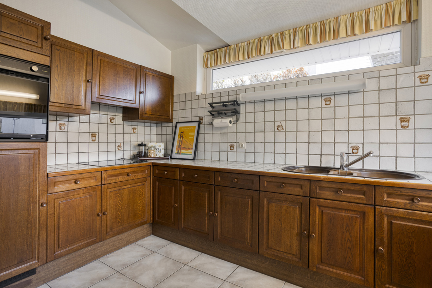 Op het tuinniveau: woonkamer ( +/-40m²) met toegang tot zuid-oost gerichte tuin en terras - keuken (+/-9m²) (oven, afwasmachine, frigo, elektrische kookplaat, dubbele spoelbak) - toilet met lavabo.