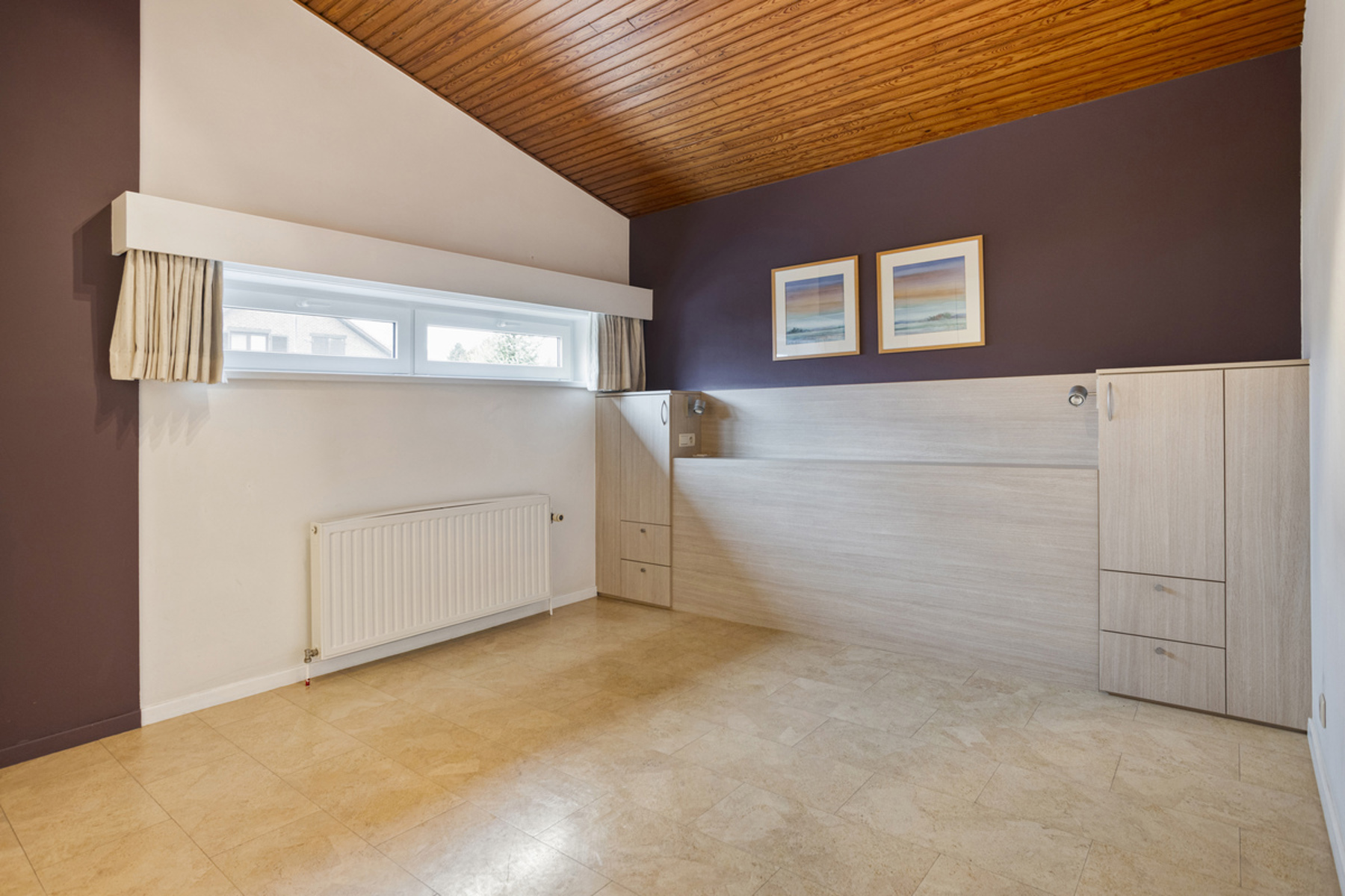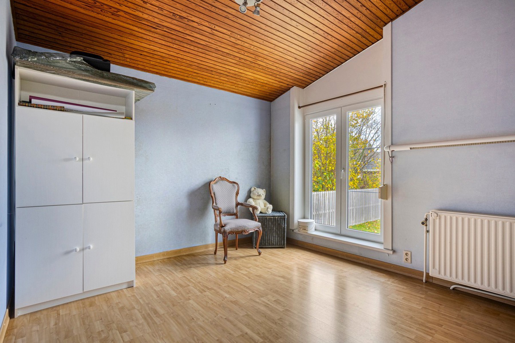 Tweede verdieping: 3 slaapkamers (+/-15m², +/-14m², +/-8m²) - badkamer (bad, toilet en lavabo).
